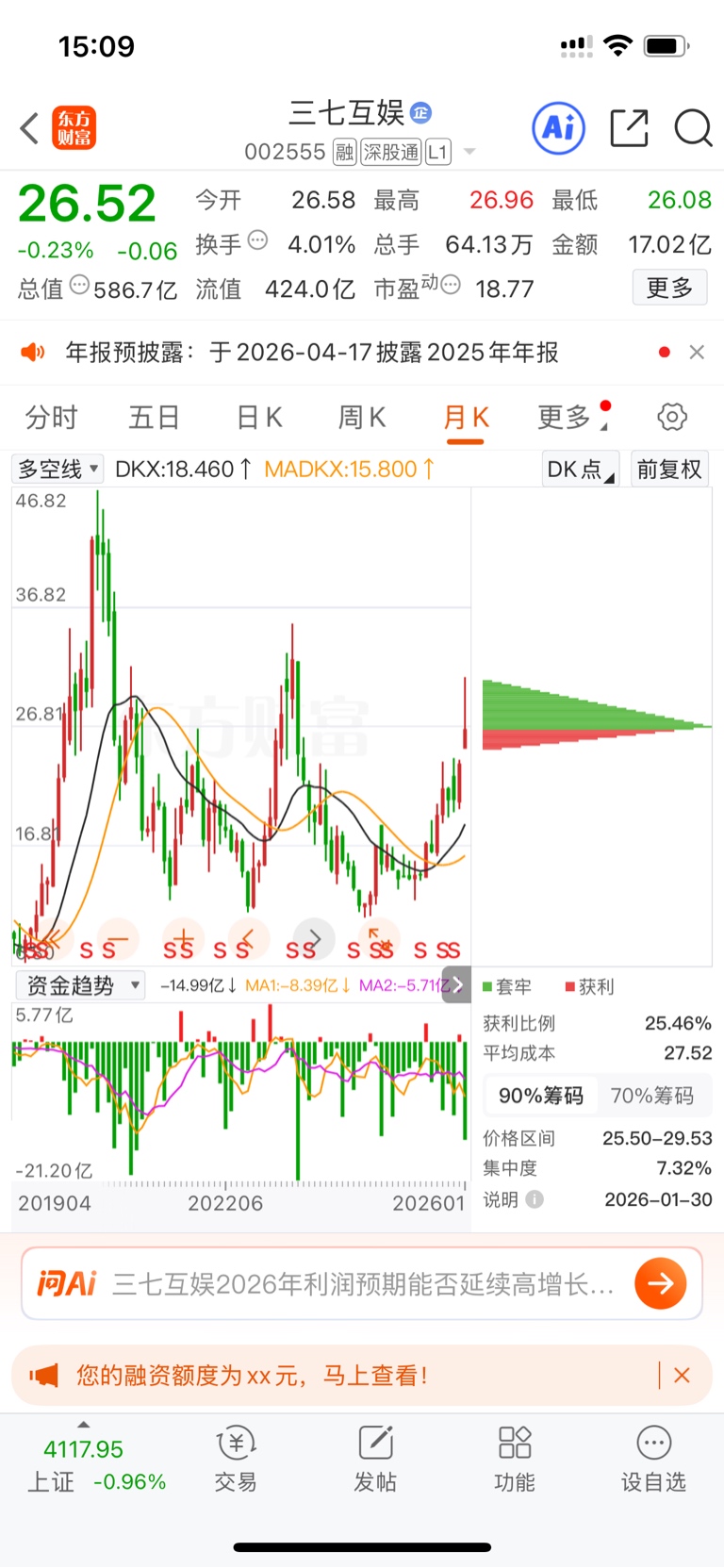 $三七互娱(SZ002555)$ 月线长上影,从历史来看,都是大顶。从筹码来看,洗盘相当成功,要想把底部筹码集中到25以上,进而全面套牢,任重道远。从2026ai应用是绝对主线来看,这里仅仅是山腰。从时间节点来看,年前即下月随时有暴击的可能。就问你麻不麻?我是韭菜,最近有点麻
