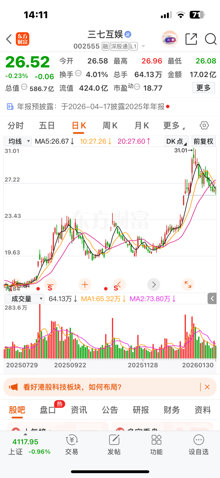 $三七互娱(SZ002555)$ 全股吧的看过来,口诀已经量身定制,看下图,这个点位就按口诀操作,绝对稳妥,记住口诀:26上下不补仓,不新买,小涨小卖,大涨大卖,留足资金23元建半仓疯狂做T。信,就绝对不会输。