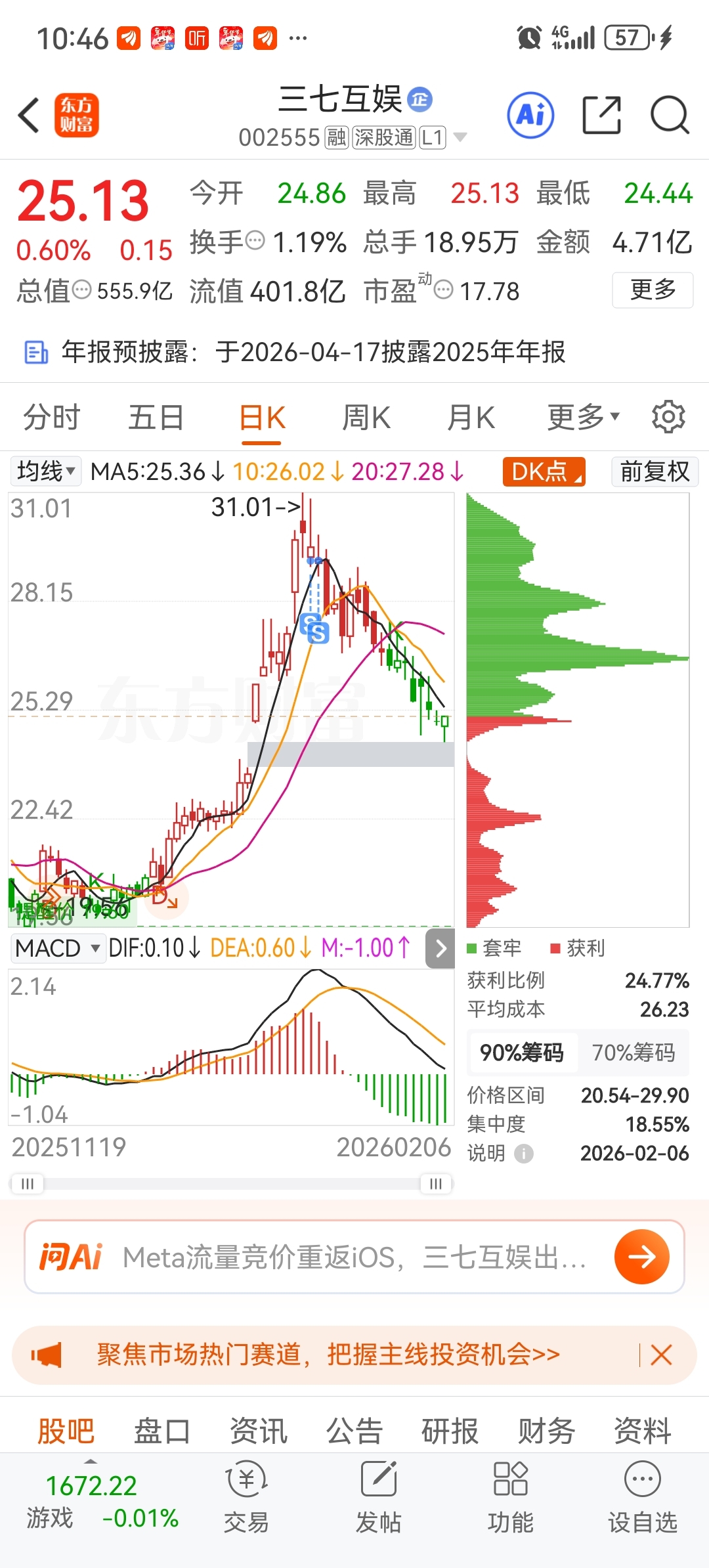 $三七互娱(SZ002555)$ 还没到底