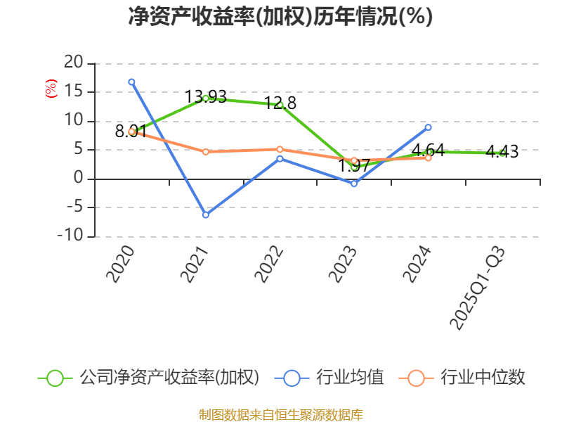 盈利能力方面, 2025年前三季度公司加权平均净资产收益率为4.43%,同比下降0.56个百分点。公司2025年前三季度投入资本回报率为3.36%,较上年同期下降0.01个百分点。
