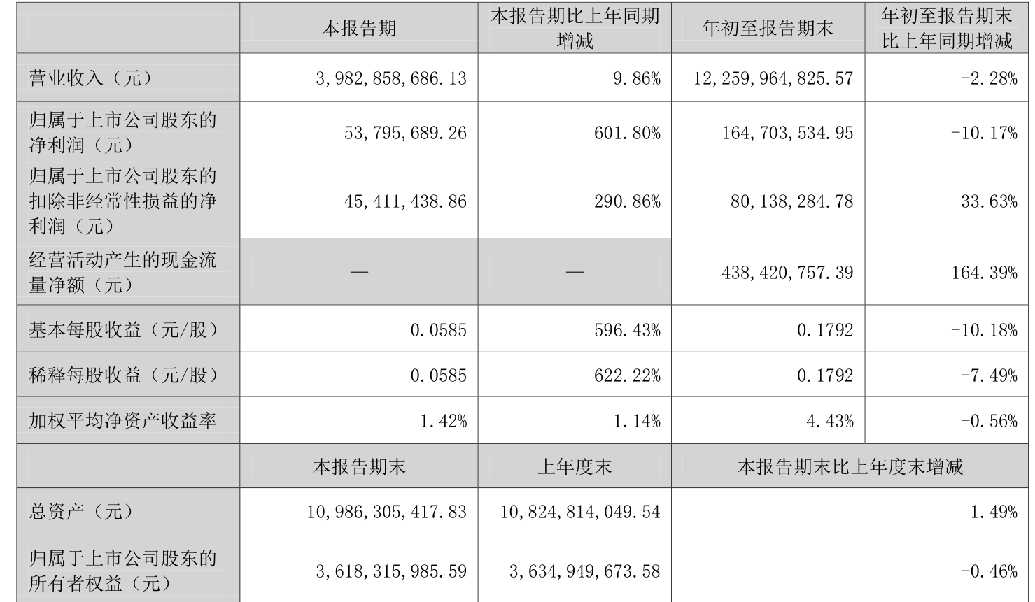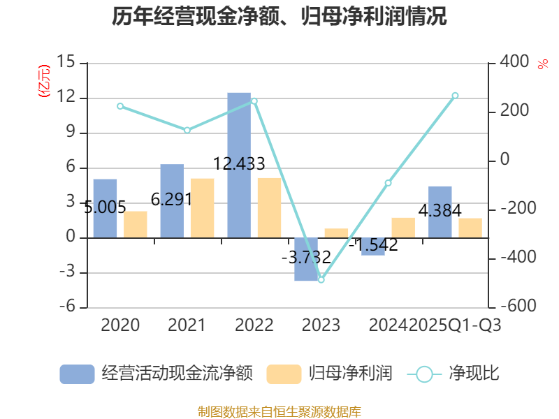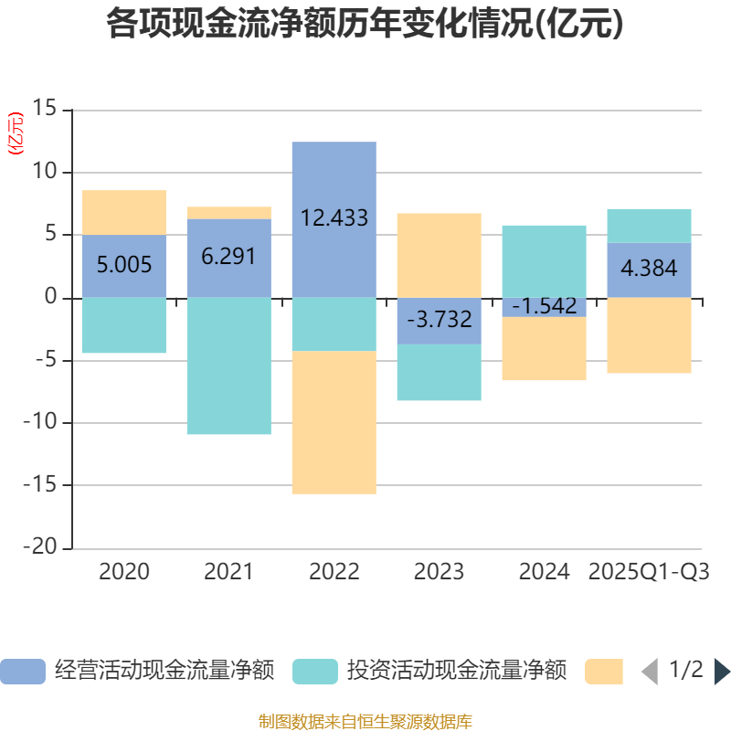 2025年前三季度,公司经营活动现金流净额为4.38亿元,同比增加11.19亿元;筹资活动现金流净额-6.02亿元,同比减少6.85亿元;投资活动现金流净额2.68亿元,上年同期为5.87亿元。