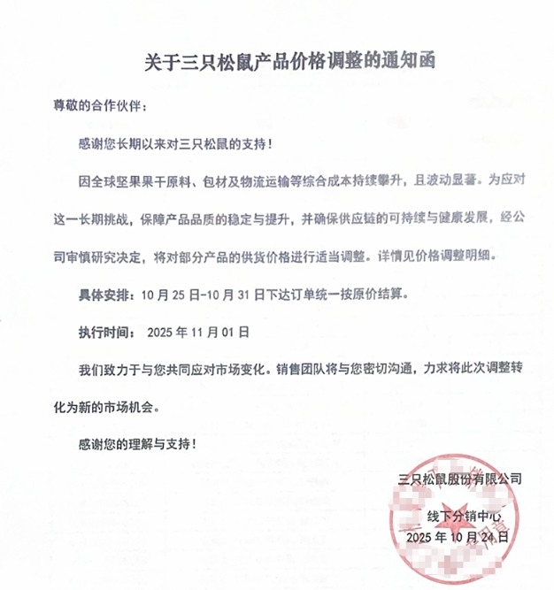 $洽洽食品(SZ002557)$ 三只松鼠涨价啦!