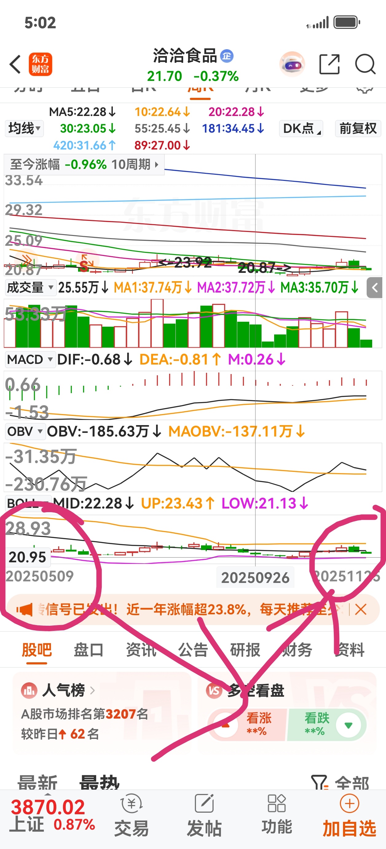 $洽洽食品(SZ002557)$ 布林下轨对应20.95元,肯定要跌破的(也就是21块必然会跌破),这是股票运行的铁律,就看是阴跌还是急跌。