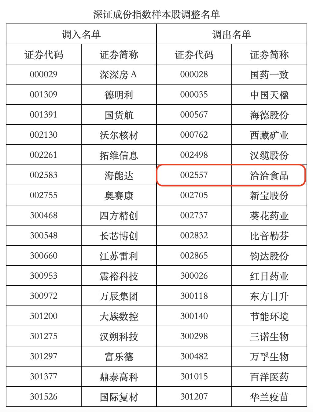 其中,“瓜子大王”洽洽食品(002557)被调出深证成份指数样本股。本次调整将于12月15日正式实施。