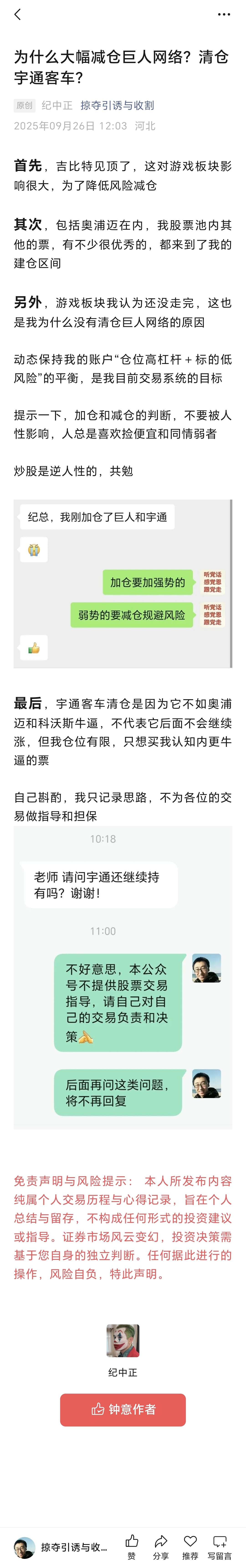 为什么大幅减仓巨人网络?清仓宇通客车?