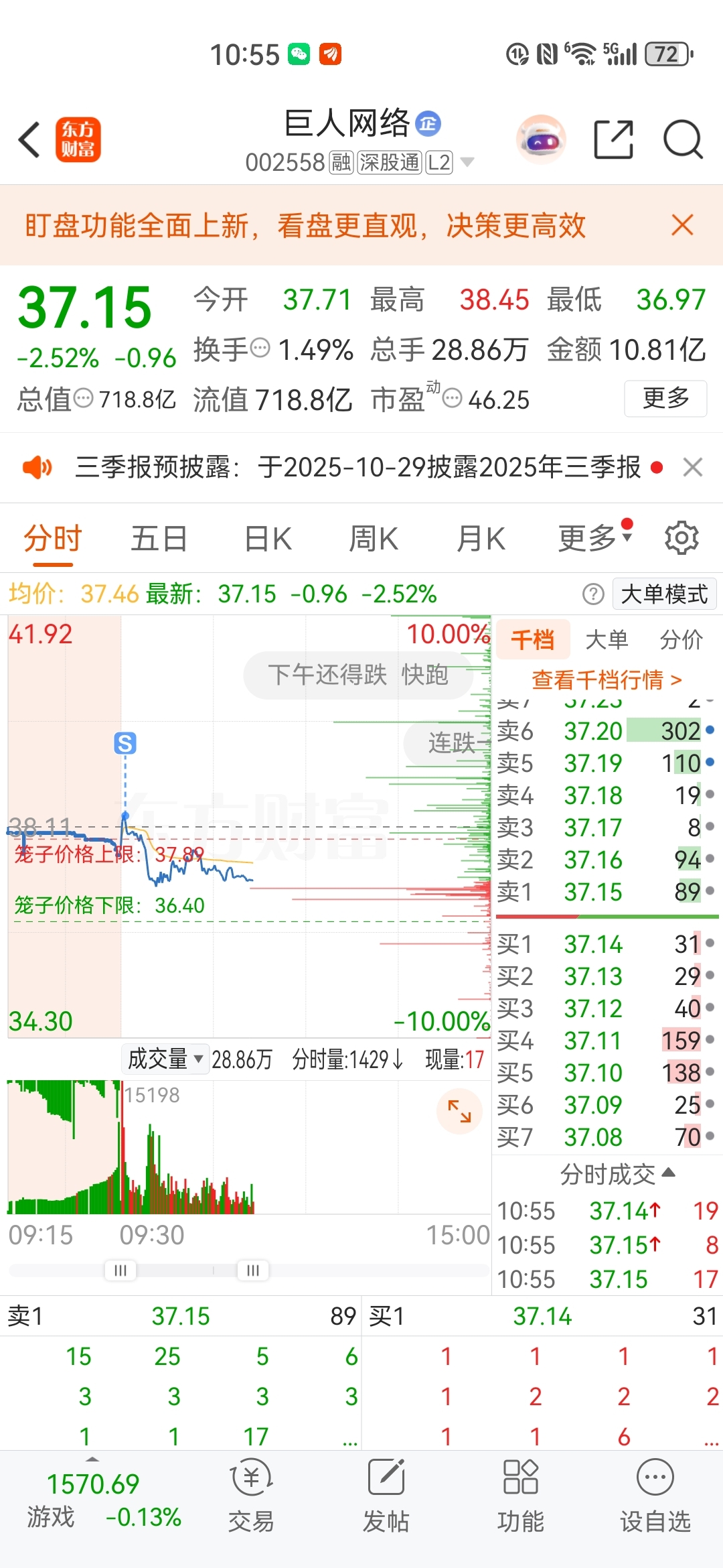 $巨人网络(SZ002558)$ 跑了点, 诶,这