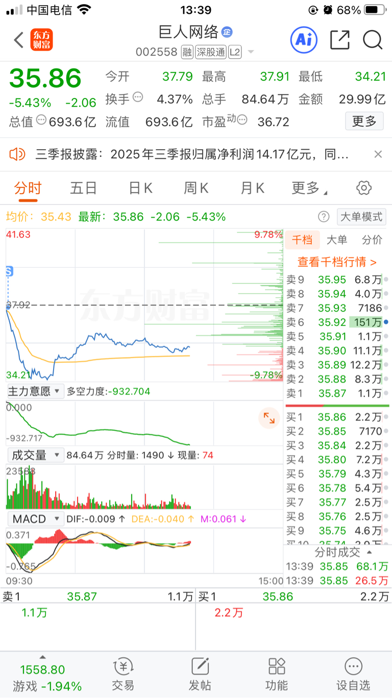 $巨人网络(SZ002558)$ 早上离场了,底部也没参与,今天放量大跌直接破位,下午40分钟流出接近七千万,主力头也不回的离场了,个人建议下跌趋势没企稳之前想玩最好就轻仓,抄底毛病,最怕抄在半山腰,如果触发基金止损就难受了