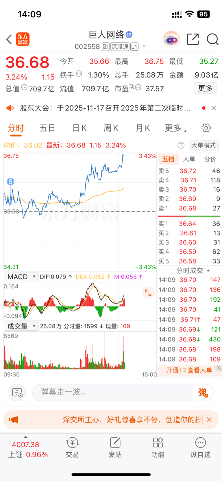 $巨人网络(SZ002558)$ 十天没卖过,今天一卖就涨?我真的不知道说什么了