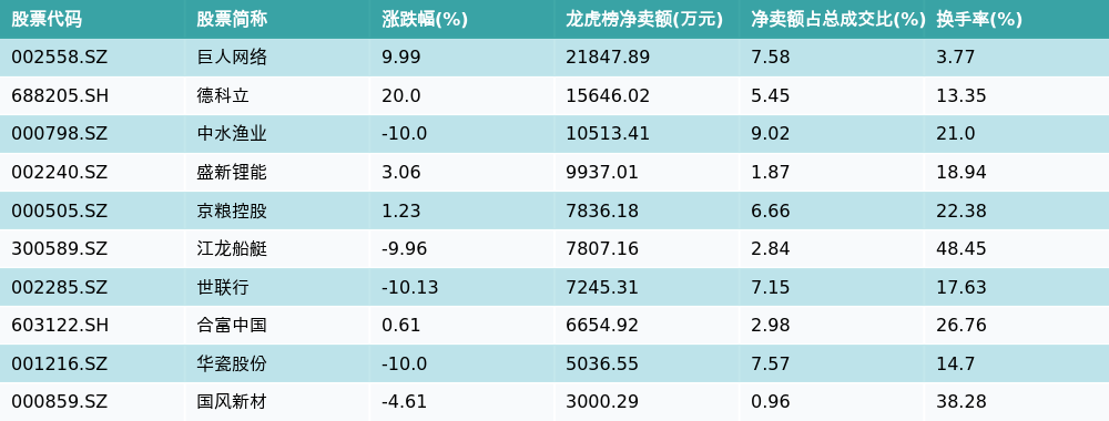 南财智讯11月25日电,南财金融终端数据显示,因当日异动登上龙虎榜的个股中,龙虎榜中资金净流出最多的前三位分别是巨人网络(002558.SZ)、德科立(688205.SH)与中水渔业(000798.SZ)。其中排名第一的巨人网络被净卖出2.18亿元,占总成交金额的7.58%。巨人网络收盘上涨9.99%,换手率为3.77%。净卖出额前10个股详情见下图: