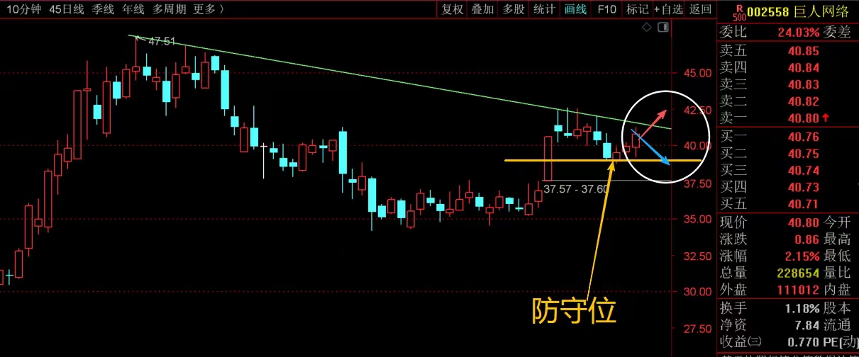 $巨人网络(SZ002558)$ 近期有点想要突破的意思了,主要就是看能否带量站稳头上的趋势线,能突破站稳,至少短线空间就打开了,比较稳健,但如果突破未遂就要防着回落风险,脚底蓝色均线作为防守位应对,稳住就还行,有效跌破就要注意减仓应对了。#炒股日记# #收盘点评#