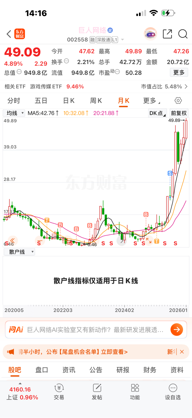 $巨人网络(SZ002558)$ 多么好的W。大腿拍断,应激反应,看到绿色十字星就跑路了