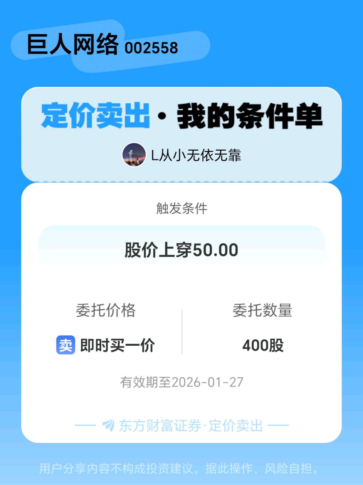 #条件单交流# #定价卖出晒单# 一位股神设置了一个定价卖出条件单,接下来就是见证奇迹的时刻~$巨人网络(SZ002558)$