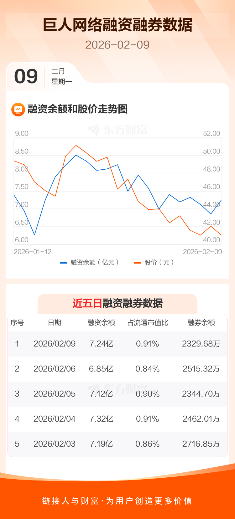 交易所最新数据显示,巨人网络于2026年2月9日获融资买入9221.92万元,融资偿还5300.03万元,当日融资净买入3921.89万元。目前,该股融资余额7.24亿,占流通市值比例为0.91%。