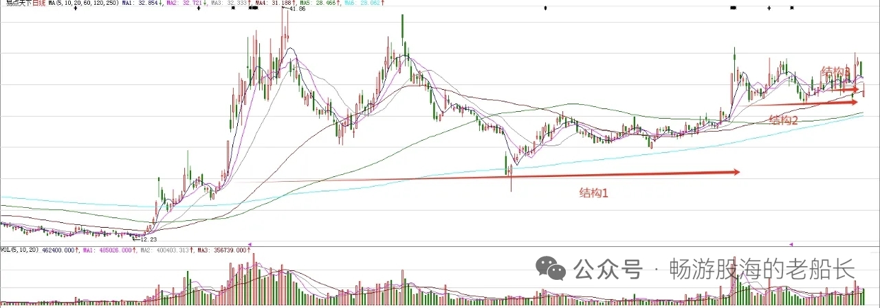 图中标注的结构1突破,意味着股价处在上涨趋势。结构2和结构3突破,意味着股价已经开始波段上涨。短暂震荡调整后,股价还会继续波段上涨。