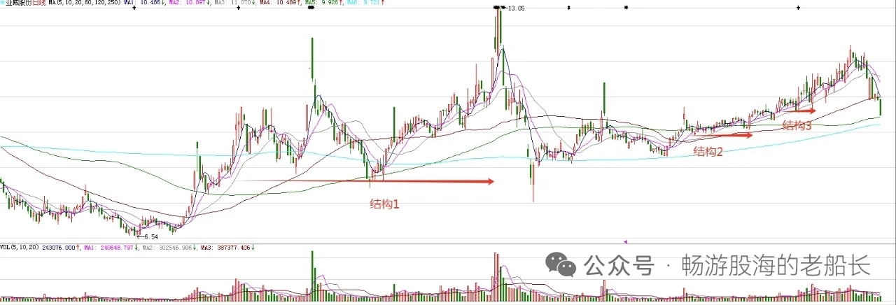 周五跌幅明显,但是相对还是不错的。短线来看有惯性下探,但是周一探底回升是大概率事件。周期面到了变盘节点,加上到了长期均线处。最近的调整,是结构2和结构3突破后的回踩,是正常的调整。调整幅度受大环境影响,极端情况下,会再回踩下结构2的下轨。大型结构1突破,意味着股价处在上涨趋势。结构2和结构3突破,意味着新的波段上涨已经拉开帷幕。