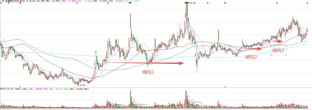 今天低开高走,收出小阳线,释放了企稳信号。周期面来看,昨天是第五个有效周期,是变盘节点,今天回踩了五日均线,大概率一步到位。图中标注的结构1突破,意味着股价处在上涨趋势。结构2和结构3突破,意味着波段上涨开始。接下来,股价还会继续波段上涨。
