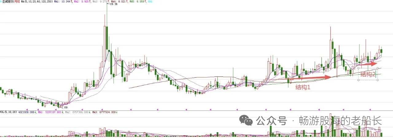 结构1突破之后,进入到回踩阶段,直至结构2突破。结构2突破,意味着新的波段上涨开始。走了三个有效周期后,十月是第四个周期,是变盘节点,回踩了五单位月线,调整到位。接下来,股价大概率会继续波段上涨。
