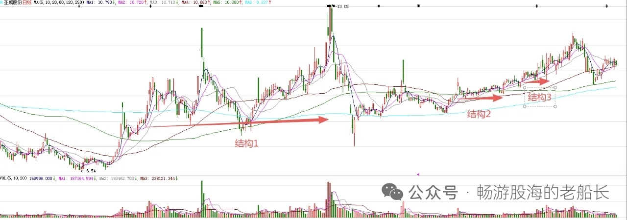 今天调整,短线来看,周三股价还有调整。但是,周期面来看,到今天为止,走了八个有效周期,明天就是变盘节点。同时,三条中短期均线粘合,说明股价到了变盘节点。所以,明天大概率探底回升,走企稳信号。图中标注的结构1突破,意味着股价处在上涨趋势。结构2和结构3突破,意味着波段上涨开始。接下来,股价还会继续走波段上涨。