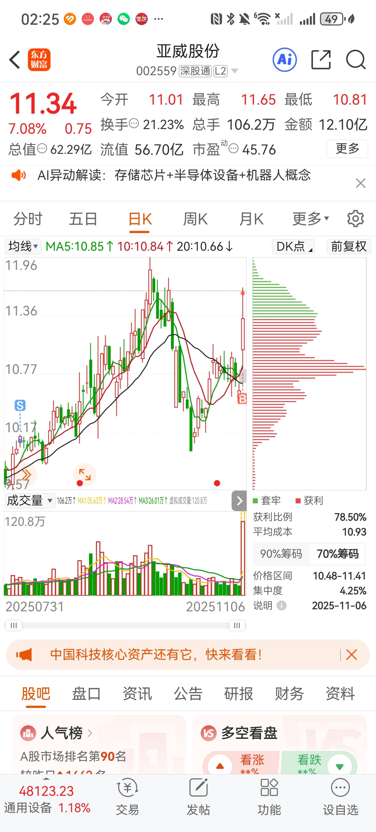 $亚威股份(SZ002559)$ 50手 天上的风好凉