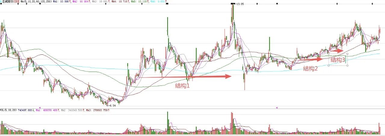 今天小幅度震荡,是正常的。昨天的涨停没封住,带有试盘和震仓的性质。下周一,盘中有震荡,但是时间短暂,随时会结束调整。图中标注的结构1突破,意味着股价处在上涨趋势。结构2和结构3的突破,意味着波段上涨开始。接下来,股价还会继续波段上涨。