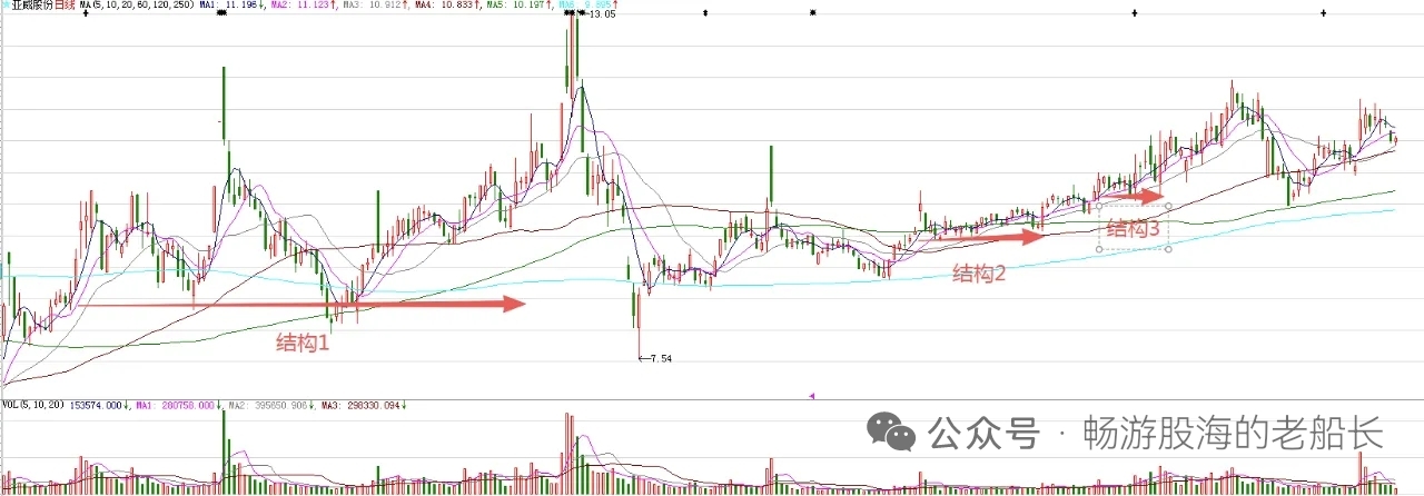 图中标注的结构1突破,意味着股价处在上涨趋势。结构2和结构3突破,意味着波段上涨开始。接下来,股价大概率还会继续波段上涨。