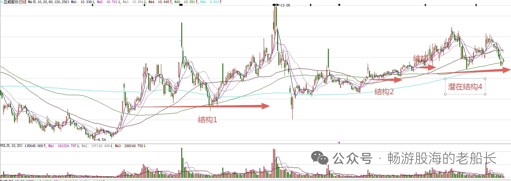 $亚威股份(SZ002559)$ 冲高回落,小幅度上涨,短线来看,周三股价大概率还有调整。接下来几个交易日,股价大概率会再度回踩最近低点。不过,到了年线附近,大概率就是中期调整的低点了。这样的话,图中标注的区域,就形成了潜在结构4,这是结构3突破后的回踩,是正常的调整。结构1突破,意味着股价处在比较大的上涨趋势。结构2和结构3突破,意味着波段上涨开始。待调整结束,波段上涨大概率还会继续。