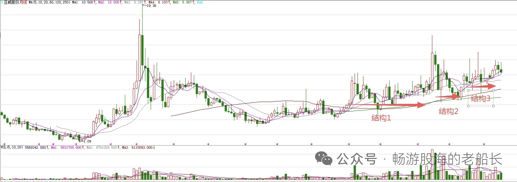 $亚威股份(SZ002559)$ 月线级别的走势来看,最近两个月,股价调整。这是图中标注的结构3突破后的回踩,是正常的调整。周期面来看,到本月为止,走了五个有效周期,已经到了变盘节点。下个月开始,股价有望走上涨走势。图中标注的大型结构1突破,意味着股价处在比较大的上涨趋势。结构2和结构3的突破,意味着波段上涨开始。接下来,股价还会继续波段上涨。