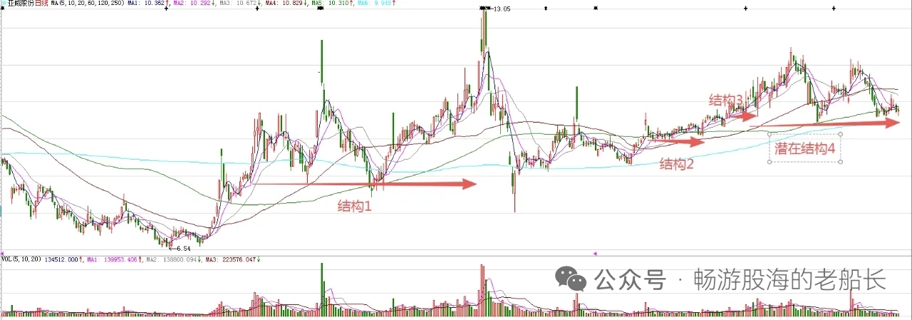 日线级别的走势来看,今天探底回升,基本符合预期,释放了企稳信号。周五,股价大概率继续上涨。股价走到这里,中期调整大概率要结束了。图中标注的结构1突破,意味着股价处在比较大的上涨趋势。结构2和结构3突破,意味着波段上涨开始。结构4是结构3突破后的回踩,是为了蓄势开始新的波段上涨。