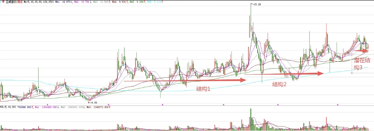 最近两周,走出小阳线,释放了连续企稳信号。这里,大概率在构筑图中标注的结构3,结构3的主要作用,就是蓄势突破前期长时间构筑的高点区域,毕竟,被套筹码比较多。只是很多人看不明主力的意图,被盘面迷惑了。图中标注的大型结构1突破,意味着股价处在大型的上涨趋势。结构2是结构1突破后的回踩,意味着波段上涨拉开帷幕。接下来,结构3大概率会逐步实现突破,为后期上涨打开空间。