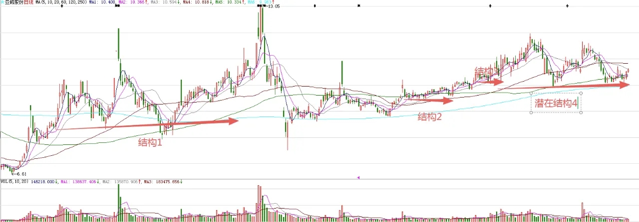 走出小阳线,股价运行到了二十日均线处,短线来看,周二股价大概率有调整。但是中期低点已经得到了两次确认,因此,短线调整幅度不大。图中标注的结构1突破,意味着股价处在比较大的上涨趋势。结构2和结构3突破,意味着波段上涨得到确认。结构4是结构3突破后的回踩,是上涨途中的调整。现在,潜在结构4右边的低点基本得到确认。