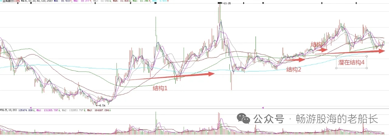 日K线比较特殊,这是短线调整到位的信号。周期面来看,周三是第四个有效周期,到了变盘节点。所以,周三股价大概率企稳回升。同时,二十日均线已经充分走下来,走到了结束的时候。图中标注的大型结构1突破,意味着股价处在比较大的上涨趋势。结构2和结构3突破,意味着波段上涨开始。潜在结构4是结构3突破后的回踩,接下来,股价大概率要走波段上涨。