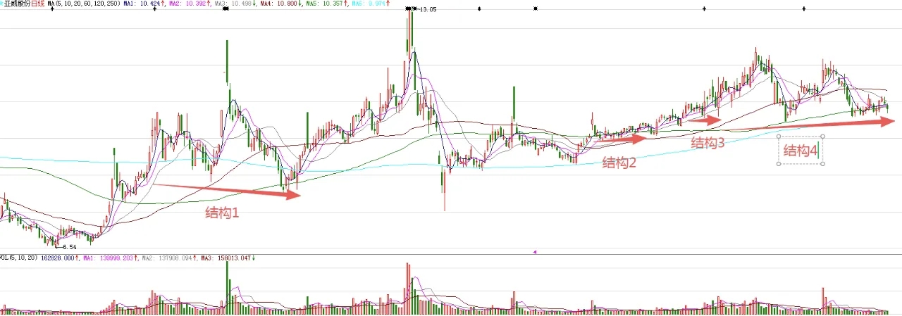 $亚威股份(SZ002559)$ 股价小幅度震荡,探底回升,再度回踩了近期的低点区域,获得支撑。周四,股价大概率还有震荡,回踩今天的下影线。不过,调整的空间到了。经过近期的震荡之后,二十日均线已经充分走下来,基本完成了修复。所以,中期调整随时会结束。图中标注的结构1突破,意味着股价处在大型上涨趋势。结构2和结构3突破,意味着波段上涨开始。结构4是结构3突破后的回踩,是正常的调整。