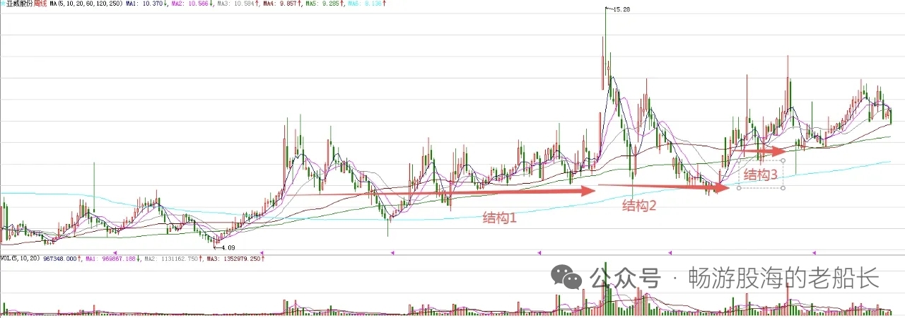 周线走势来看,最近一段时间,股价处在震荡状态,这个调整,主要是蓄势突破长期以来的高点区域。股价到了二十单位均线处,调整空间也基本到了。所以,接下来,股价企稳回升,是主基调。图中标注的大型结构1突破,意味着股价处在大型的上涨趋势。结构2是结构1突破后的回踩,意味着后期有波段上涨。结构3是结构2的延续,意味着波段上涨拉开帷幕。所以,近期的调整,是上涨过程中的调整。