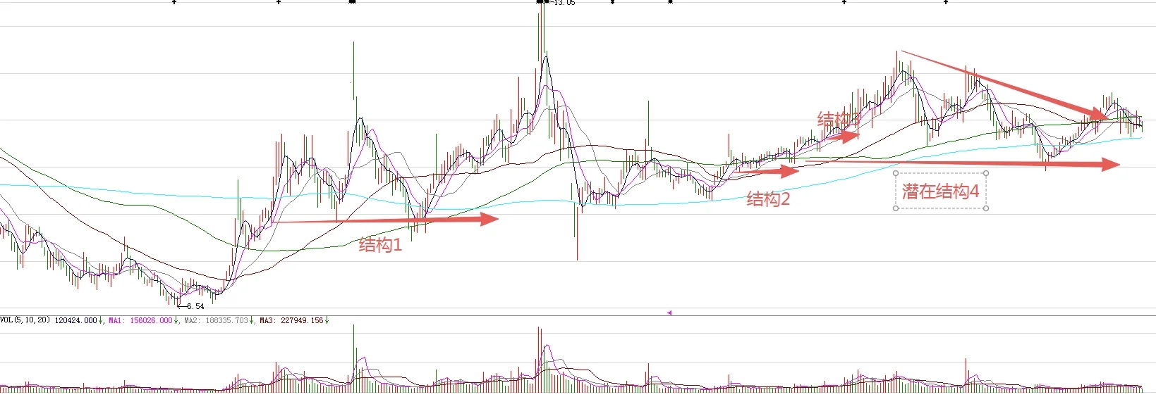 亚威股份,日线级别的走势来看,今天走出了比较特殊的K线,释放了强势调整到位的信号。所以,短线股价大概率企稳回升。最近几个交易日的K线,也构筑了潜在阶段性底部形态。分析方法,写在三部书稿中。六十日均线快速下行后,很快会走平,所以接下来股价大概率会逐步突破底部形态。 近期的调整,出现在图中标注的潜在结构4突破的临界点位置,是为了蓄势突破结构4.结构1突破,意味着股价处在上涨趋势。结构2和结构3突破,宣告了波段上涨开始。接下来,股价逐步走波段上涨是大概率事件。