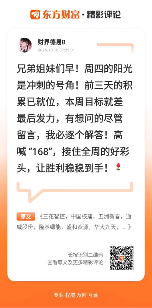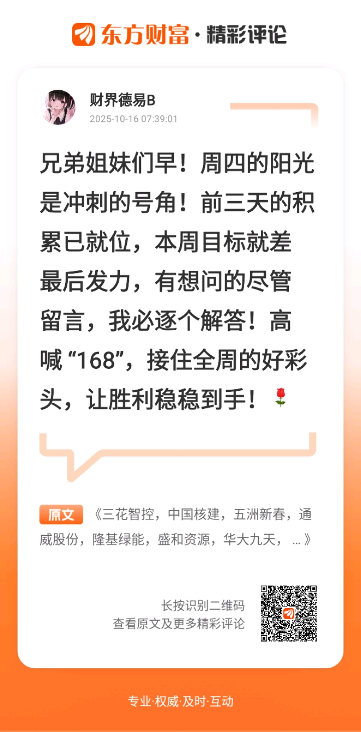 干货多,学到不少//@财界德易B :兄弟姐妹们早!周四的阳光是冲刺的号角!前三天的积累已就位,本周目标就差最后发力,有想问的尽管留言,我必逐个解答!高喊 “168”,接住全周的好彩头,让胜利稳稳到手! $通达股份(SZ002560)$$久其软件(SZ002279)$$伊戈尔(SZ002922)$
