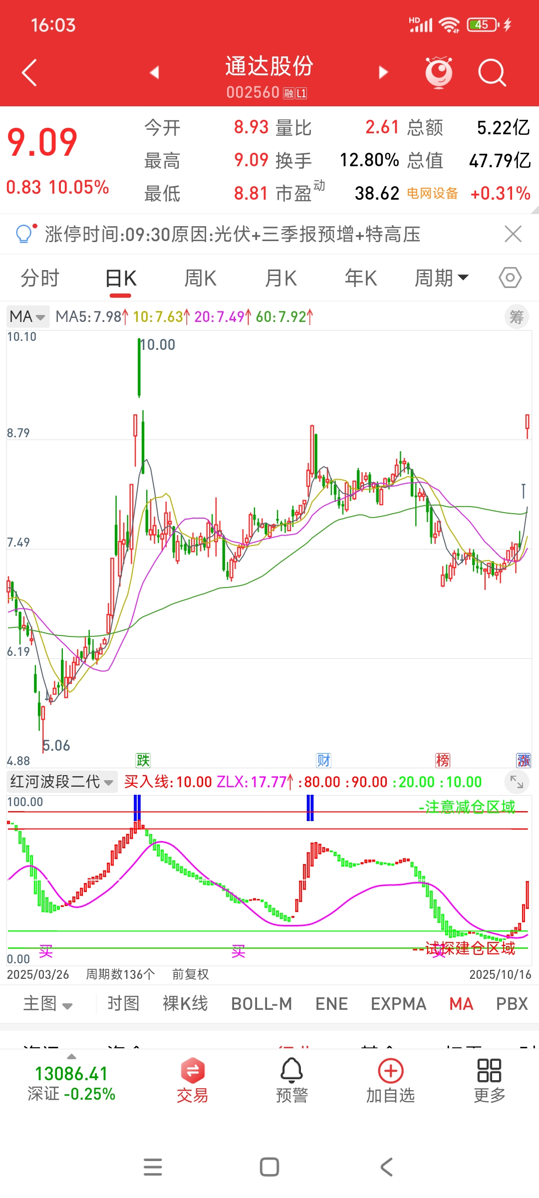 $通达股份(SZ002560)$ 底部出现买字以后,绿柱转红柱做确认,红柱一路延续,所以价格一路上扬,那就没什么好说的了,红柱不停,上涨不止,红柱拉长,加速不止,继续