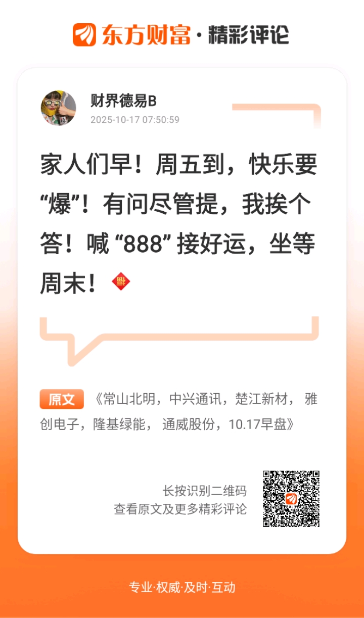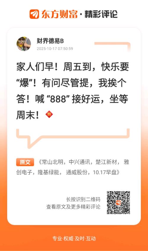 文章清晰容易明白,赞//@财界德易B :家人们早!周五到,快乐要 “爆”!有问尽管提,我挨个答!喊 “888” 接好运,坐等周末! $通达股份(SZ002560)$$四方股份(SH601126)$$海南华铁(SH603300)$