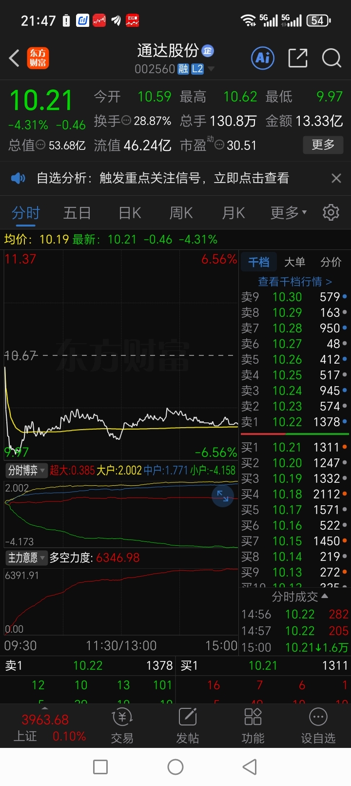 牛逼,通达股份全是大单买,小单卖,散户全洗走了,保佑我下周一一字涨停板能买到通达