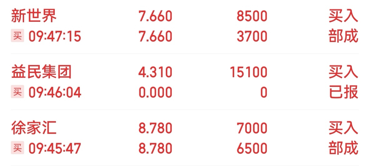 $徐家汇(SZ002561)$ $红旗连锁(SZ002697)$ $益民集团(SH600824)$ 剩下的看样子今天是买不到了,明天继续挂买单