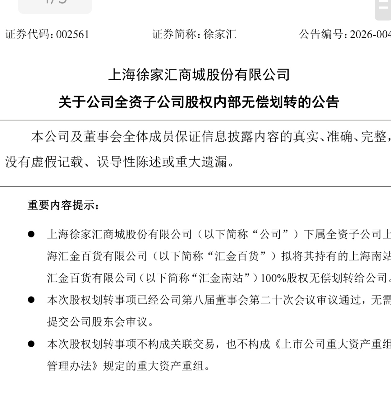 $徐家汇(SZ002561)$ 划重点,无偿划转,这不白送的资产吗?明天一字板还能买到吗?