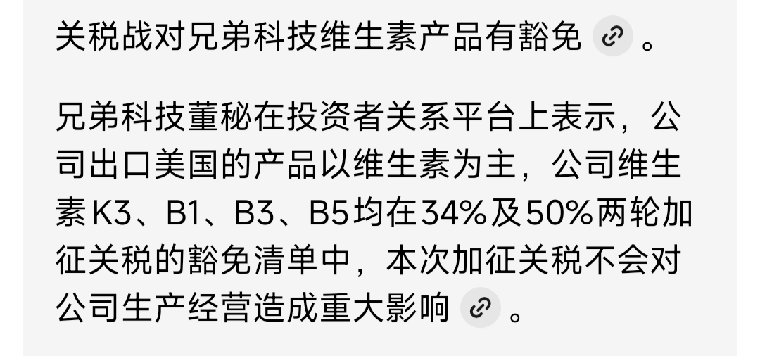 $兄弟科技(SZ002562)$ 关税战,兄弟科技维生素一直在豁免清单,说跌停的无脑唱空。且9.29FDA确认NMN合法用于膳食补充,兄弟科技全球NMN产量第一,占据美国NMN,60%市场。叠加业绩预增,说跌停的都是没票的
