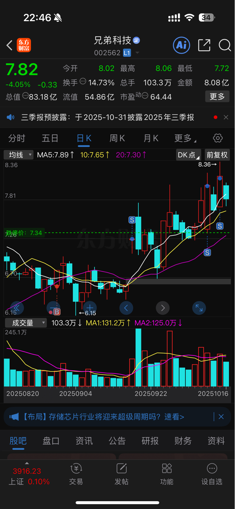 $兄弟科技(SZ002562)$ 声明:不是我卖蹦的,但觉得它还能涨,趋势没坏。