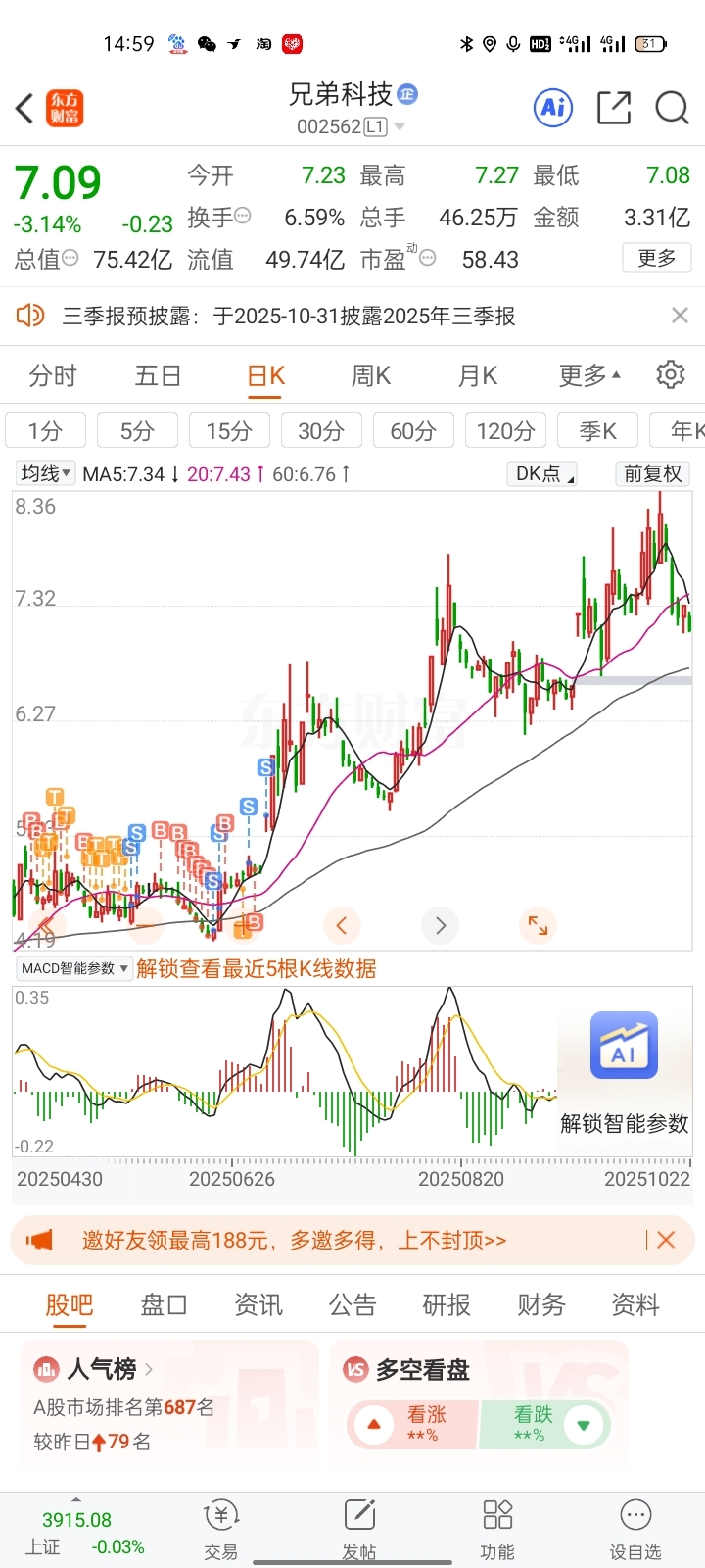$兄弟科技(SZ002562)$ 兄弟约会去了进不