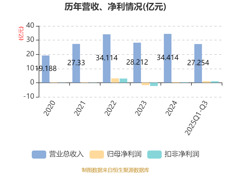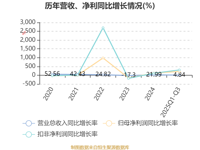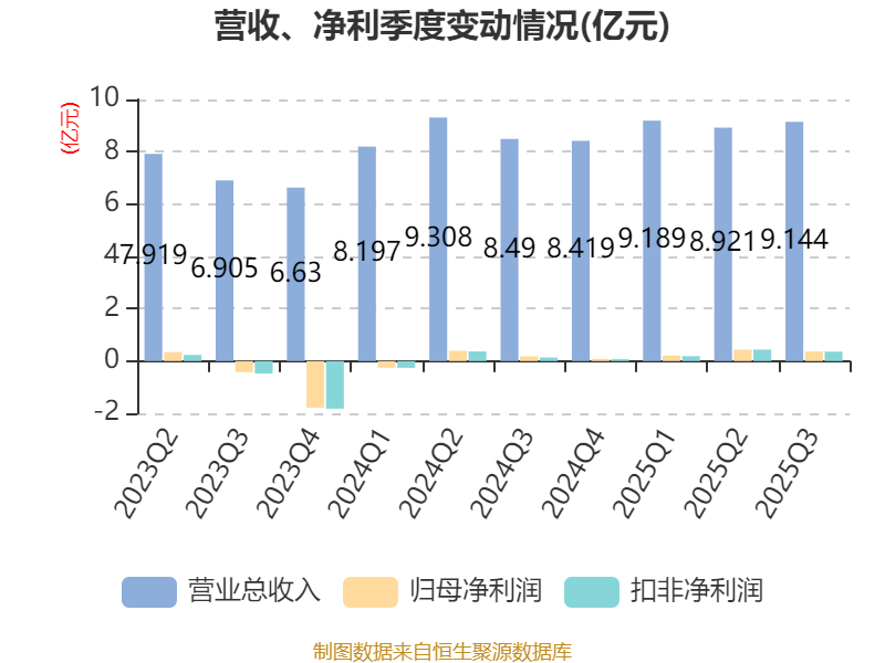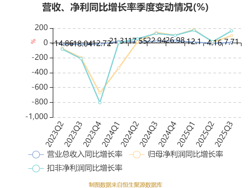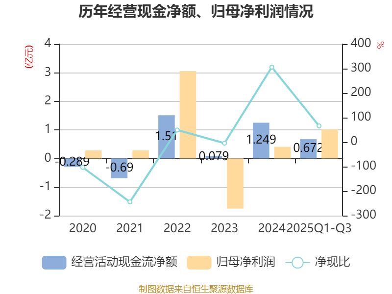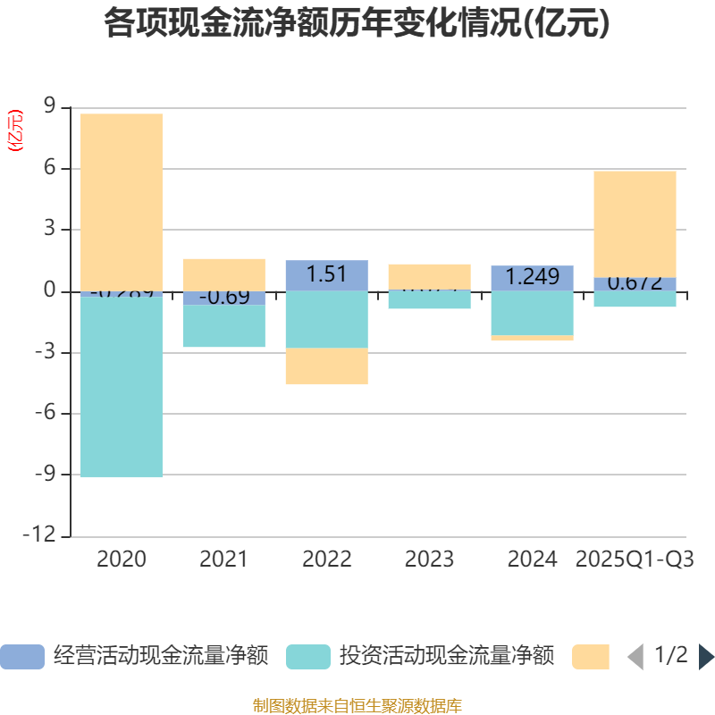 2025年前三季度,公司经营活动现金流净额为6716.5万元,同比增长585.1%;筹资活动现金流净额5.2亿元,同比增加5.31亿元;投资活动现金流净额-7632.59万元,上年同期为-8105.45万元。