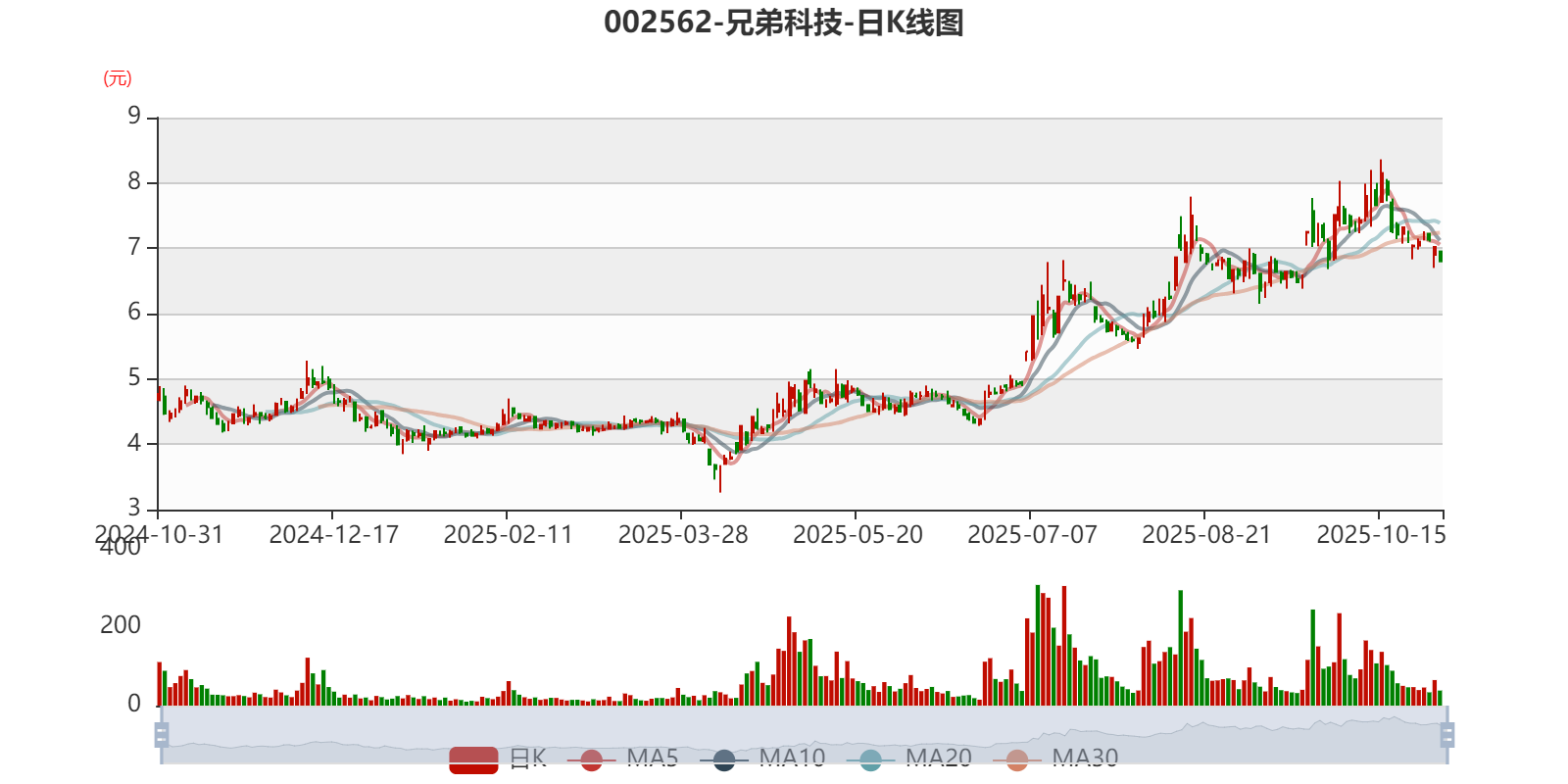 中证智能财讯兄弟科技(002562)10月31日披露2025年第三季度报告。前三季度公司实现营业总收入27.25亿元,同比增长4.84%;归母净利润1.01亿元,同比增长211.75%;扣非净利润9864.92万元,同比增长298.45%;经营活动产生的现金流量净额为6716.5万元,同比增长585.10%;报告期内,兄弟科技基本每股收益为0.0954元,加权平均净资产收益率为3.22%。