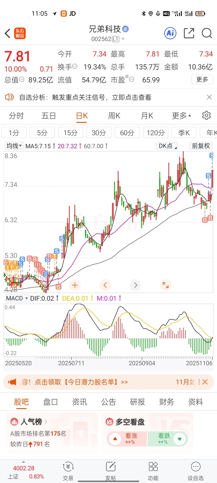 $兄弟科技(SZ002562)$ 又没吃上肉,去你的