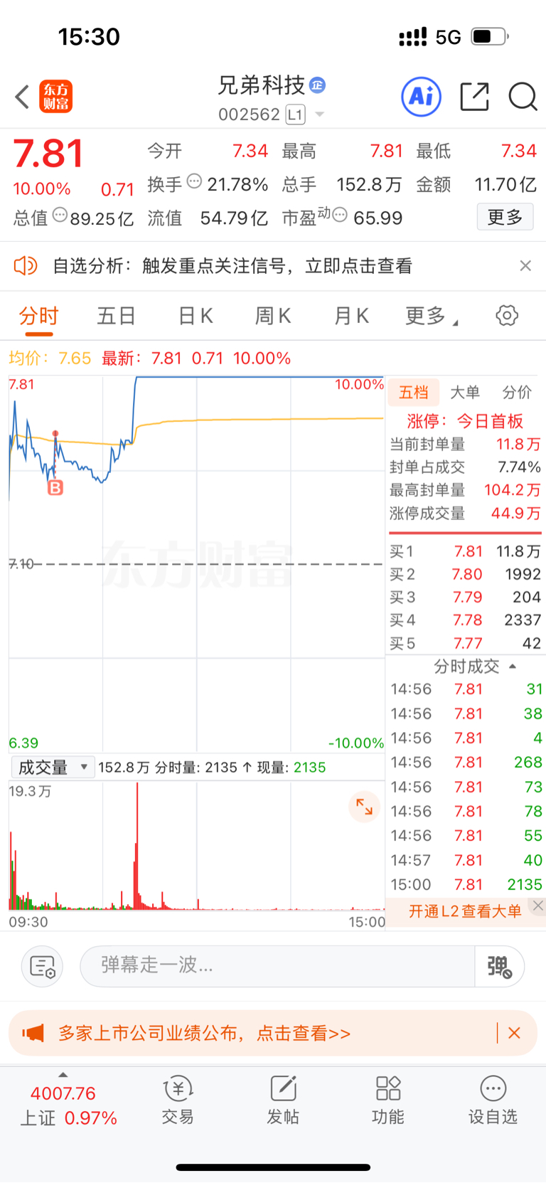 $兄弟科技(SZ002562)$ 做兄弟在心中