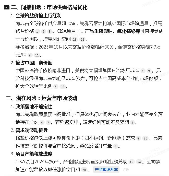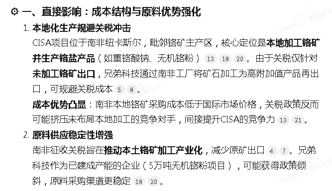 $兄弟科技(SZ002562)$ 兄弟在,南非纽卡斯尔的朗盛CISA的产品产业链包括,重铬酸钠,铬酸,铬鞣剂