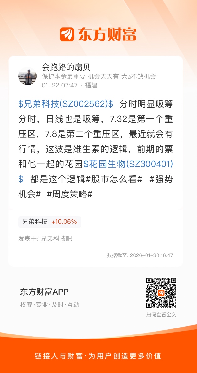 $兄弟科技(SZ002562)$ 分时明显吸筹分时,日线也是吸筹,7.32是第一个重压区,7.8是第二个重压区,最近就会有行情,这波是维生素的逻辑,前期的票和他一起的花园$花园生物(SZ300401)$ 都是这个逻辑#股市怎么看# #强势机会# #周度策略#