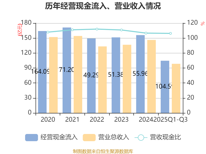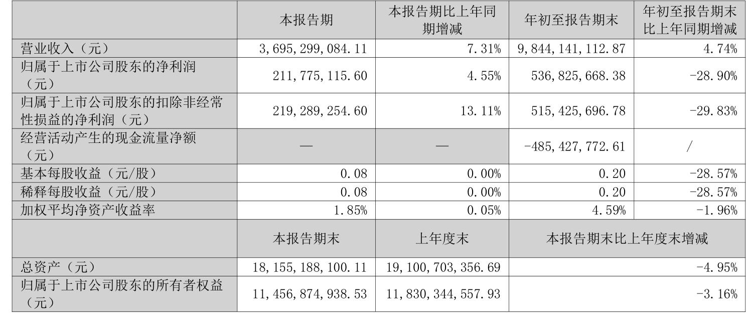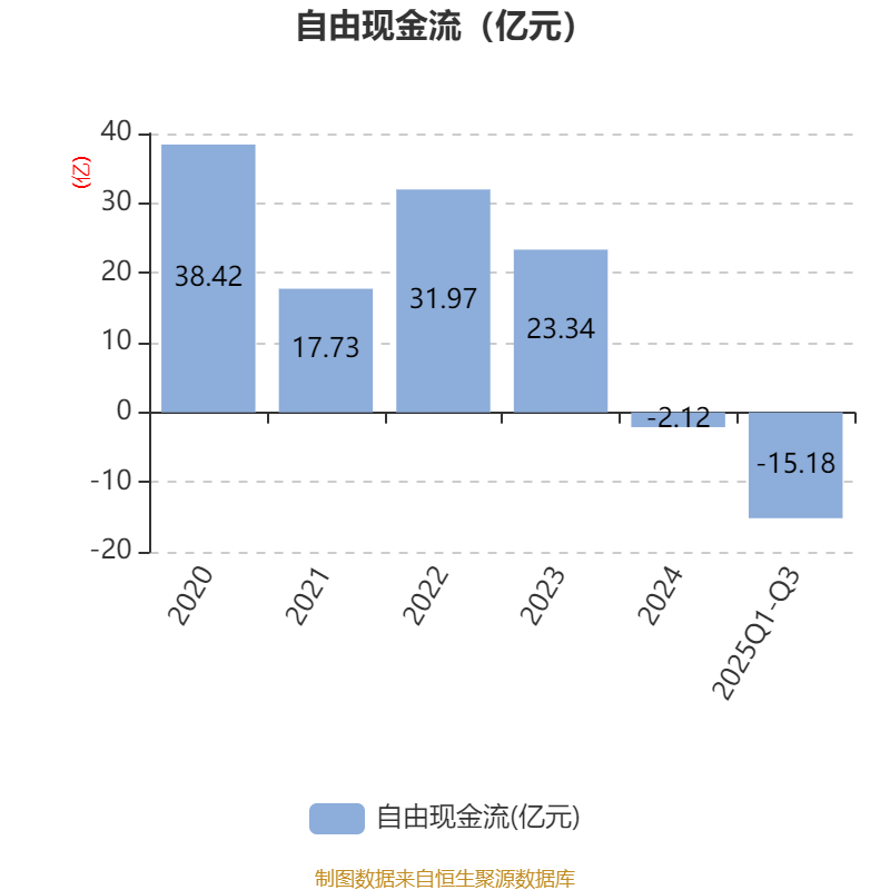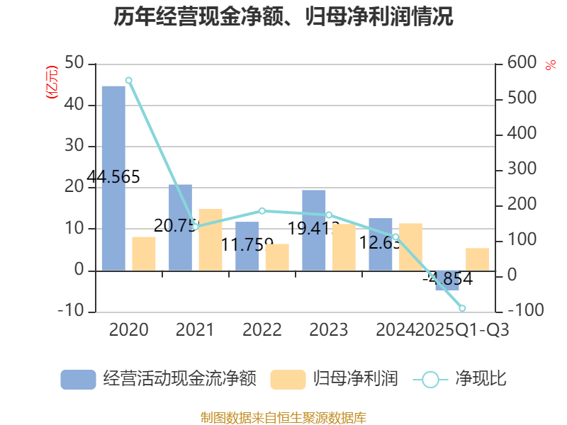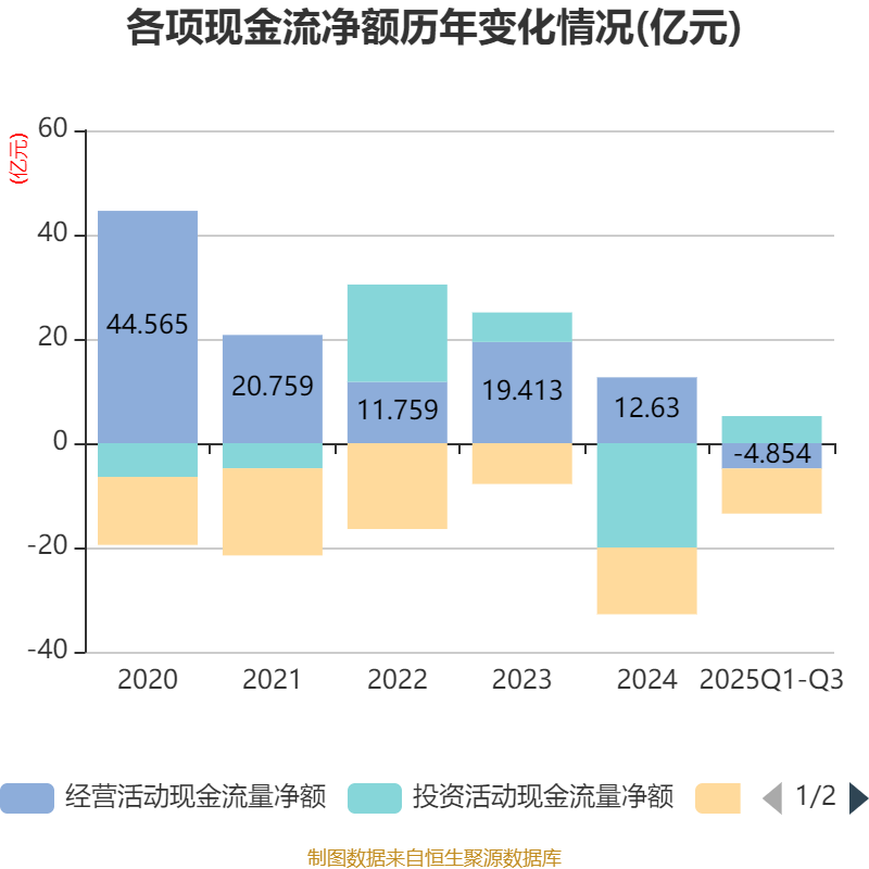 2025年前三季度,公司经营活动现金流净额为-4.85亿元,同比减少1.2亿元;筹资活动现金流净额-8.65亿元,同比增加8.34亿元;投资活动现金流净额5.2亿元,上年同期为-9.42亿元。